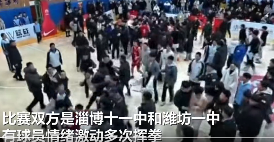 此时淄博一位女性观众进入场地推搡潍坊一中14号李晨阳,并因反作用力摔倒,其他观众见状一拥而上,导致事态升级。被场内观众围堵期间,潍坊一中14号李晨阳做出挥拳动作后,试图跑离围堵观众。在此期间,潍坊一中4号张耀文和淄博十一中25号庞子杭,也有向围堵观众挥拳的行为。