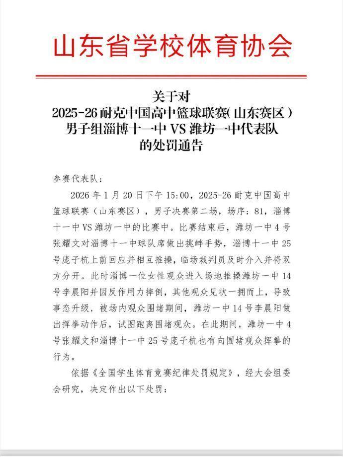 山东省学校体育协会关于对2025-26耐克中国高中篮球联赛(山东赛区)男子组淄博十一中VS潍坊一中代表队的处罚通告,具体如下: