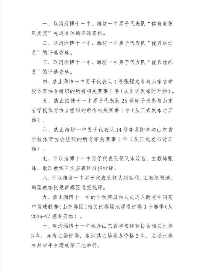 9、禁止淄博十一中的非秩序册内人员进入耐克中国高中篮球联赛(山东赛区)相关比赛场地观看比赛3个赛季(从2026-27赛季开始)。